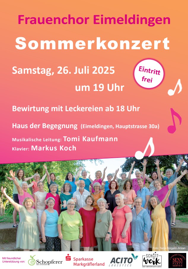 Unter dem Motto „Sommer – Sonne – Gesang“ möchten wir mit modernen und beschwingten Liedern gute Laune und Ferienstimmung verbreiten. Konzertbeginn 19 Uhr. Einlass bereits ab 18 Uhr. Kleine Bewirtung vor und im Anschluss an das Konzert.