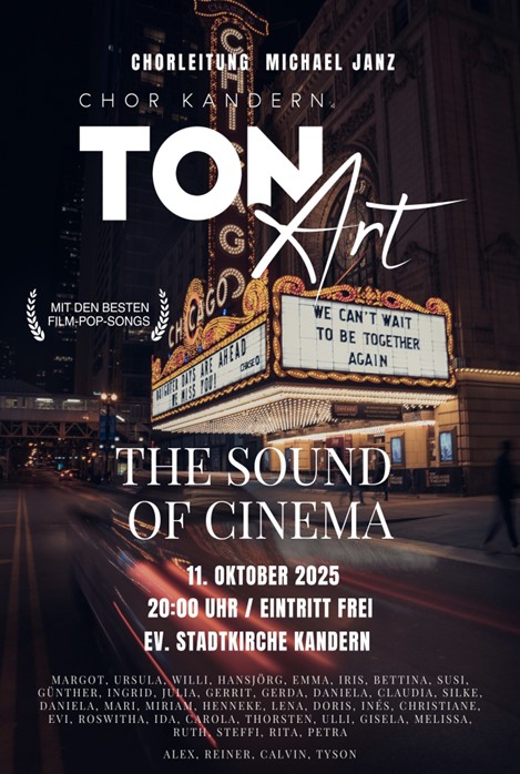 TonArt, die Chorabteilung des MGV Kandern, nimmt Sie unter Michael Janz’ Leitung mit auf eine beschwingte Reise durch 90 Jahre musikalische Highlights der Filmgeschichte. Dazu spielt die Cinema-Band.