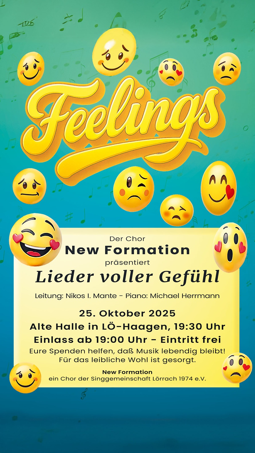 New Formation der Chor der Singgemeinschaft Lörrach 1974 e.V. präsentiert sich mit "Feelings" d.h. Lieder voller Gefühl mit einem Konzert am 25.10.2015 um 19:30 Uhr in der Alten Halle in LÖ-Haagen.