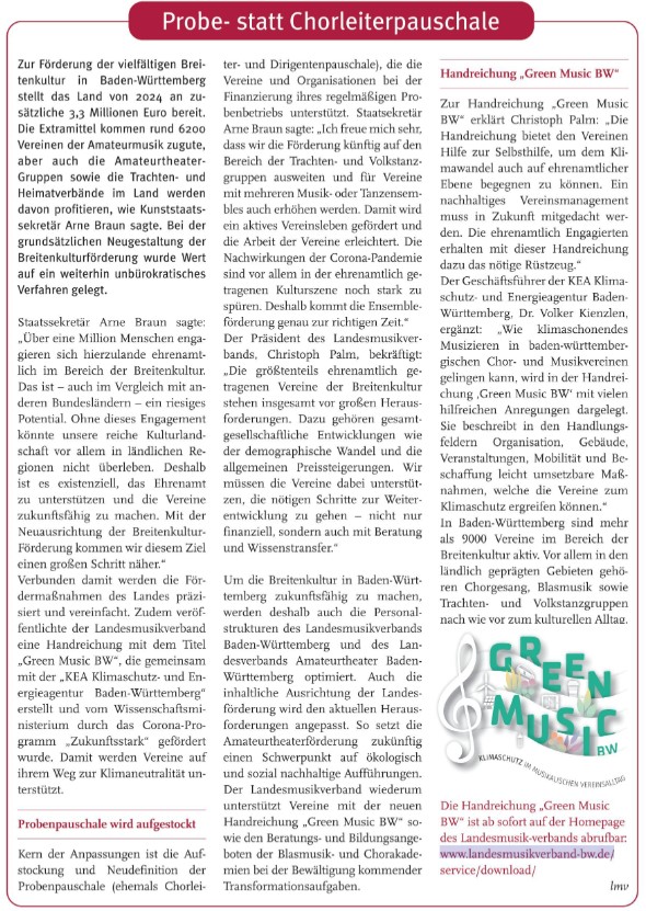 Bis zum 15.06.2024 können sich Chöre, Orchester, Musikvereine und Verbände wieder für besondere künstlerische und zukunftsweisende Projekte oder für die Durchführung einer Zukunftswerkstatt bewerben.