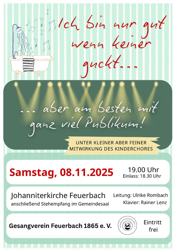 der Gesangverein Feuerbach lädt Sie herzlich zu unserem Konzert am Samstag, 08.11.2025 um 19.00 Uhr in die Johanniterkirche in Feuerbach ein.