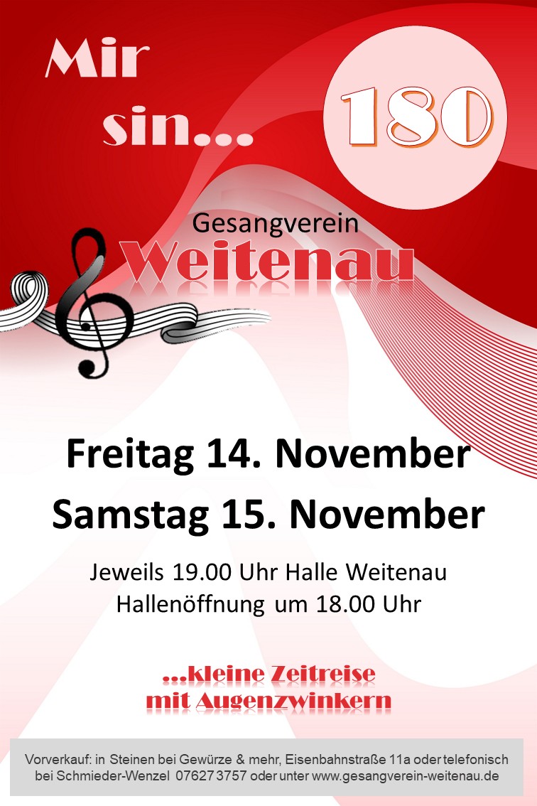 Vorverkauf in Steinen bei Gewürze & mehr, Eisenbahnstraße 11a, Karten auch über unsere Homepage www.gesangverein-weitenau.de oder telefonisch unter 07627 / 3757 oder direkt über Iby