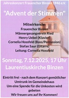 Der Frauenchor Binzen 1946 e.V. lädt ein zum "Advent der Stimmen" am 7. Dezember 2025 um 17:00 Uhr in der Laurentiuskirche Binzen.